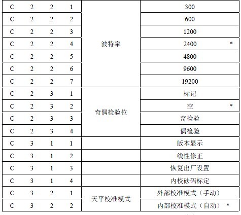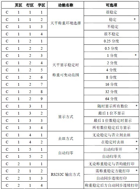 天平功能設(shè)置表(*表示出廠設(shè)置)