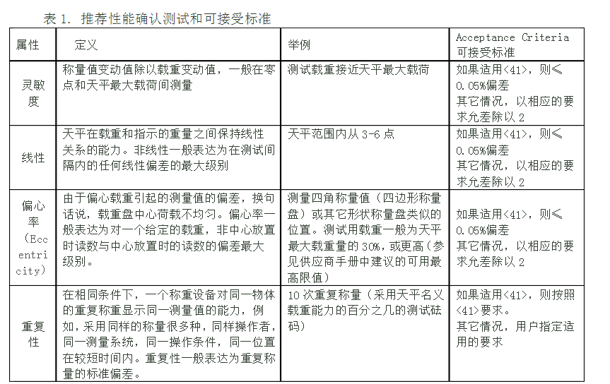 表1提供了一個天平zui重要屬性的清單,在性能確認中應該進行評估。根據(jù)應用的風險不同,要求的稱重允差不同,有時該類測試可以省略。如果有證據(jù)表明該屬性僅對稱量性能形成很小的影響,則也可以省略對其進行的測試。任何所用的程序均應與公司內(nèi)部,適用于該特定天平的標準操作規(guī)程一致,并應進行充分判定。性能確認應按標準操作規(guī)程的描述周期實施,各測試的實施頻率可能根據(jù)屬性的關(guān)鍵程度不同而不同。