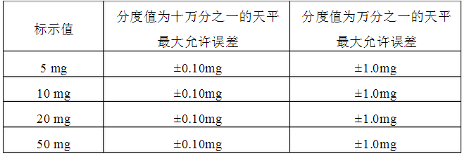 萬分之一的天平選取20mg的標(biāo)準(zhǔn)砝碼,四角誤差應(yīng)不大于0.5mg,分度值為十