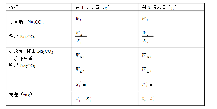 記錄1W;從其中移取約0.3~0.4g(1/3左右)于**個(gè)小燒杯中后,精確稱量剩余質(zhì)量,記錄2W;從中再移取約0.3~0.4g于第二個(gè)小燒杯中,精確稱量剩余質(zhì)量,記錄3W。 3. 再分別稱量已裝有Na2CO3樣品的小燒杯的質(zhì)量,記錄1樣W和2樣W。 4. 結(jié)果的檢驗(yàn)